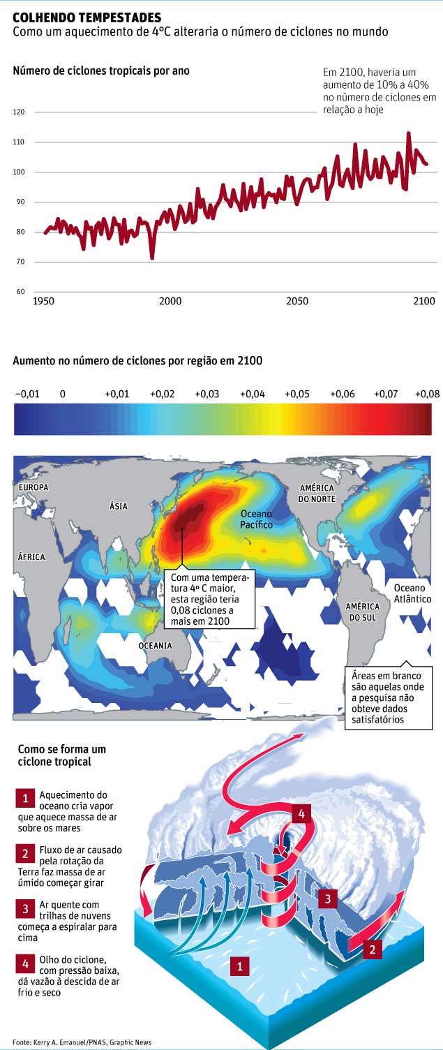 "Os ciclones tropicais ficarão mais frequentes, além de se tornarem mais intensos", disse Emanuel à Folha. "Tanto os modelos mais novos quanto os mais antigos --além dos resultados de outros grupos de pesquisa-- entram em acordo, indicando que o aquecimento do planeta resulta num aumento da frequência de eventos de alta intensidade, as categorias 3 a 5 de ciclones tropicais."