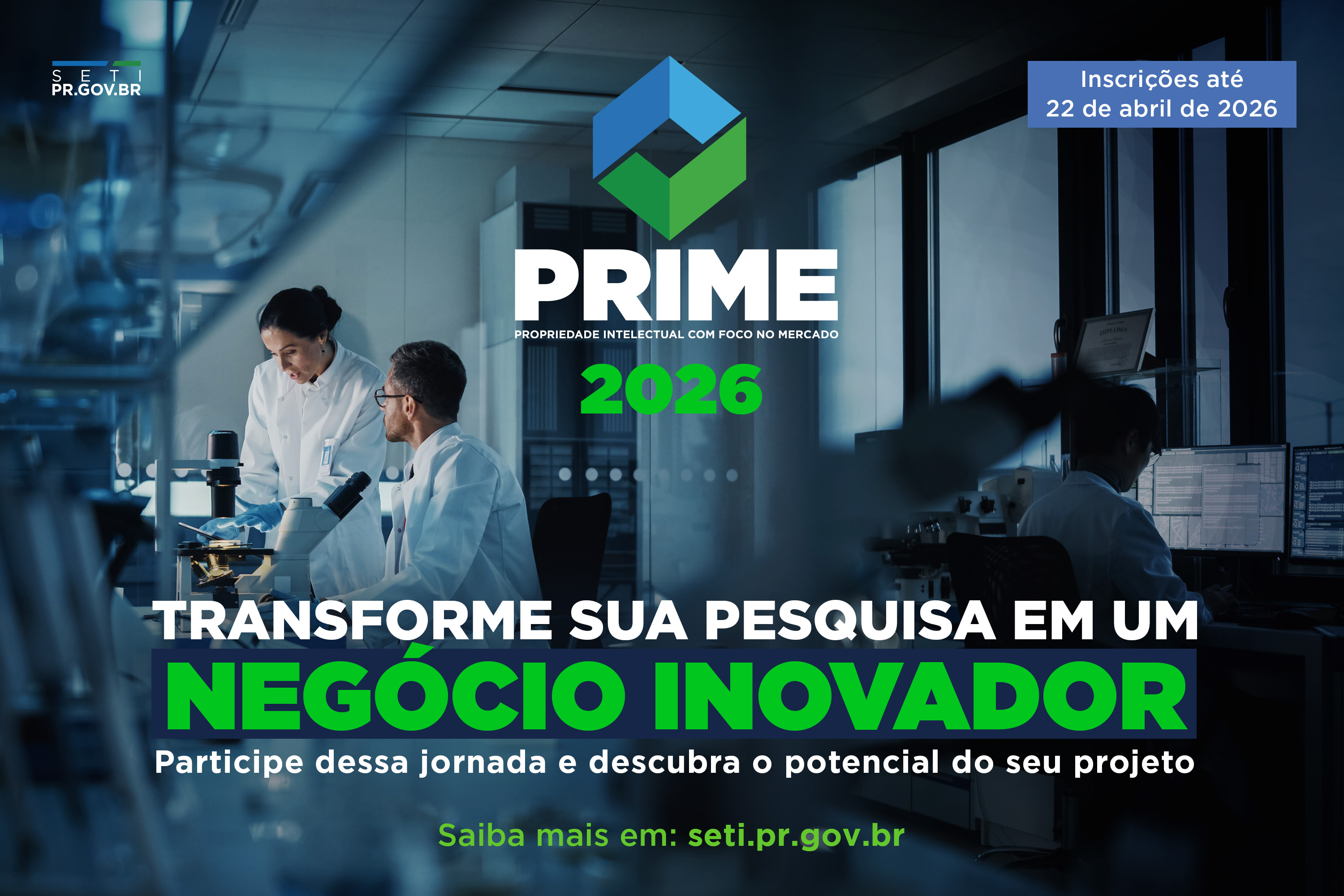 O Governo do Estado publicou o edital da sexta edição do Programa de Propriedade Intelectual com Foco no Mercado (Prime), que capacita pesquisadores do Paraná para transformar os resultados de estudos científicos em novos negócios. Estruturado em três etapas, o programa oferece 150 vagas na fase inicial em um curso de formação empreendedora, e R$ 2 milhões em aporte financeiro distribuídos entre até 10 finalistas, com R$ 200 mil para cada projeto.